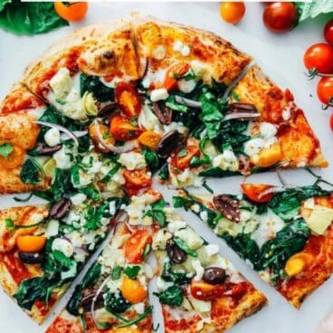 Here’s a pizza topping idea that always gets rave reviews, with its smattering of colorful vegetables and hearty flavor: this Greek Pizza with Feta! There’s nothing better than the combination of tangy artichoke hearts, refreshing bursts of tomato, garlicky spinach, and salty olives and feta. We love a great veggie pizza, and this one is what we turn to most often. It’s destined to be the smash hit of your pizza night!