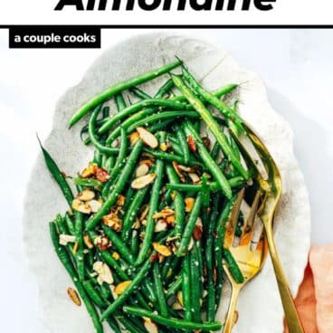 Here’s a simple way to dress up fresh green beans as a gourmet side: Green Beans Almondine! If you’re like me, you might first think of a somewhat soggy, bland version of this dish served at wedding buffets. But make it at home, and this dish is brilliant! The beans are bright green and perfectly tender, sautéed in butter with garlic and toasted almonds and finished with a little lemon zest. After one bite, we were singing its praises: then finished off the entire platter. It quickly jumped to the top of my favorite green bean dishes (like this salad and this simple side).
