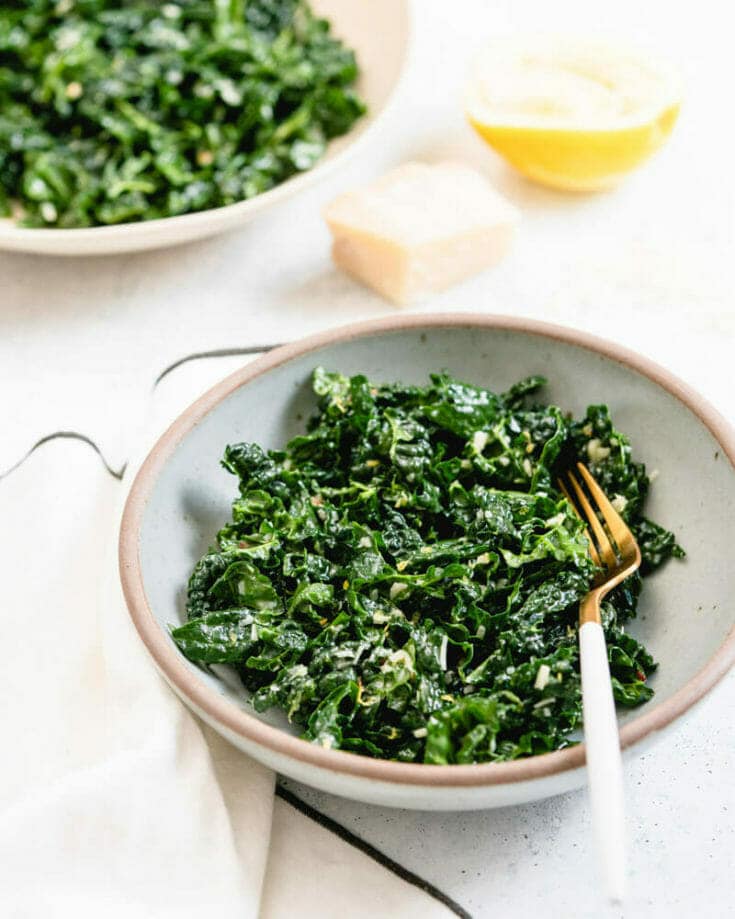 Here's another simple green salad recipe, this one starring leafy green kale! Raw kale can sometimes have a bitter taste. But with this flavor popping Italian-style dressing of lemon, Parmesan cheese, and garlic, the bitter taste of the kale is mellowed and melds beautifully with the other flavors. The sturdy texture of the kale holds up well in a salad, and provides an extra crunch when eating.