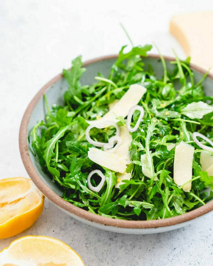 This arugula salad is quite possibly the easiest salad you’ll make. You don’t even have to make a salad dressing! Toss baby arugula simply with olive oil and lemon juice, then add Parmesan shavings and thinly sliced shallots. It's simple and so tasty, in just 5 minutes. It pairs especially well with soups, pasta and pizza!