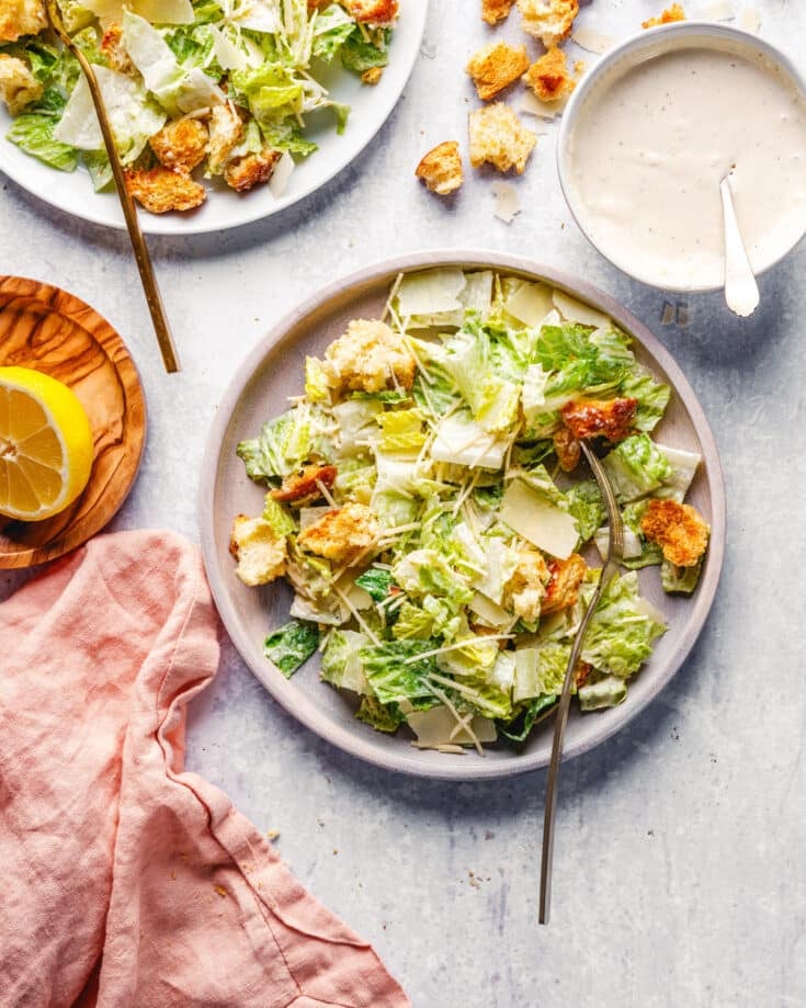 Here's a classic green salad recipe that's basic but irresistible. Meet the perfect Caesar salad! Make all the components at home and it’s a knock out stunner. The savory, creamy dressing will instantly become a household favorite. And the crunchy garlicky croutons—you’ll be eating them off the baking sheet.
