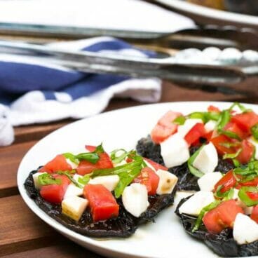 These grilled portobello mushrooms are savory and smoky, topped with a caprese style topping of fresh mozzarella, tomatoes, and basil.