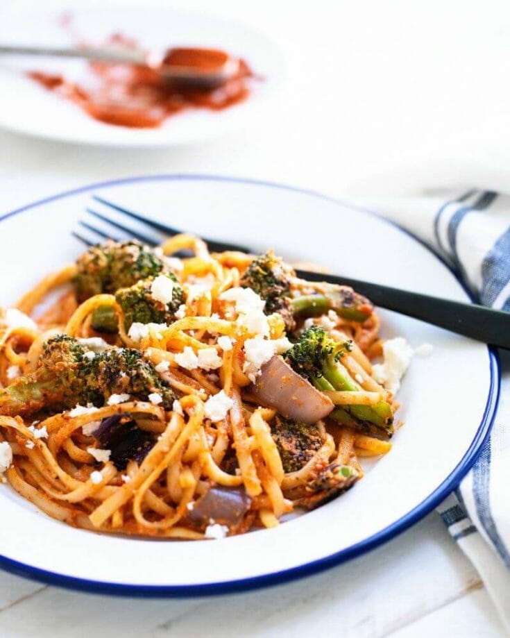 Here's a unique grilled dinner idea: grilled veggie pasta! It has double the grilled veggies: both for the pasta and blended into a grilled romesco sauce. Romesco is sauce made of roasted peppers and almonds that originates from Spain. It makes a creamy bright red sauce for the lightly smoky pasta. Top it with feta crumbles and enjoy!