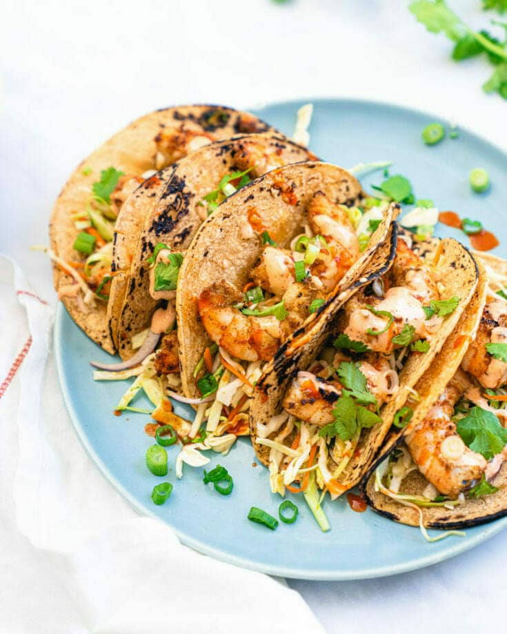 Next up in our grilled dinner ideas...one of our favorite meals ever: Shrimp Tacos! These grilled tacos have a party vibe that works for both a summer dinner party or as an easy weeknight meal. The smoky shrimp are perfectly spiced, served atop a Mexican slaw and drizzle lightly with spicy mayo. Top with a spritz of lime juice and torn fresh cilantro, they’re pretty heavenly.