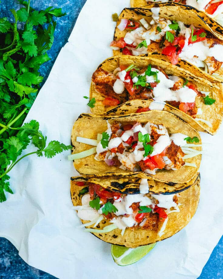 This grilled fish tacos recipe is an impressive grilled dinner that’s full of beautiful flavor! Imagine: tender, flaky white fish grilled up with cumin, chili powder, and garlic powder. Top it with the zing of pico de gallo and a tangy, creamy taco sauce, and a bit of crunchy cabbage for good measure. Piled in a charred tortilla, it’s everything you want a healthy dinner to be! (That or Grilled Shrimp Tacos, of course.)