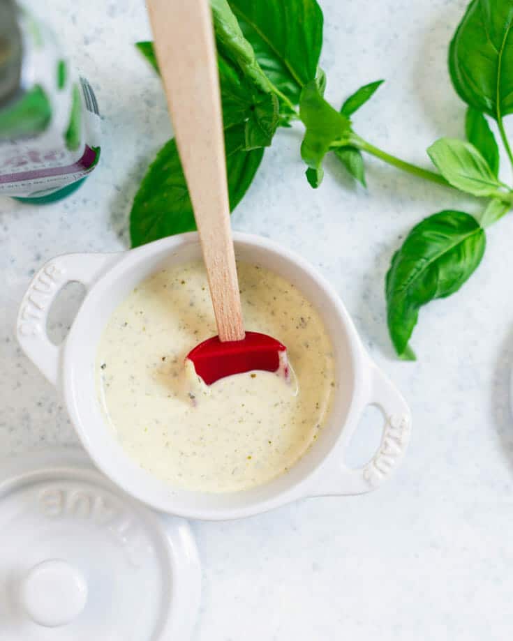 Why not put pesto in salad dressing? Turns out, this emerald green sauce adds the perfect boost to salads. This spin is a healthy salad dressing that has much less calories than the typical dressing, but is creamy and addicting. It’s kind of like a ranch dressing, but with pesto.
