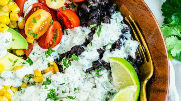 This easy rice bowl comes together in a flash! This fast dinner stars black beans and veggies with zingy cilantro lime ranch sauce.