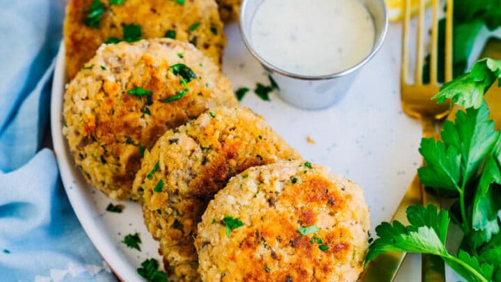 Salmon patties, aka salmon cakes -- make the best high protein lunch! Using canned salmon makes them fast and easy. Serve with tartar dipping sauce.