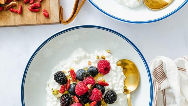 These cottage cheese breakfast bowls are a healthy and easy breakfast! Top them with berries or apple, cinnamon and a hint of honey.