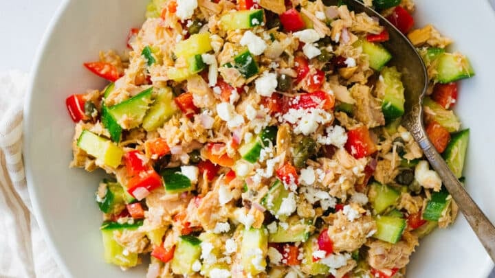 Keep your day going with these high protein lunch ideas made from healthy whole food protein sources! From fresh salads to hearty sandwiches, these recipes will keep you satisfied all afternoon long. This Mediterranean tuna salad takes just minutes to put together for a flavorful high protein lunch.