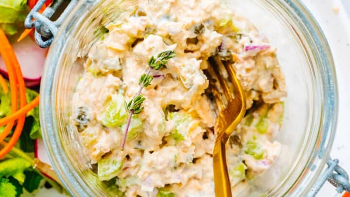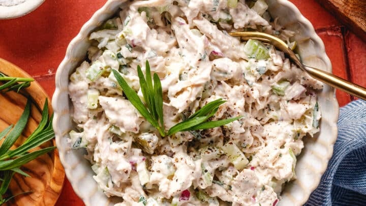 This tarragon chicken salad recipe is perfect for a high protein lunch. Savory chicken, crisp veggies, and a creamy dressing with the herbaceous pop of tarragon make a uniquely delicious sandwich or spread. It’s a family favorite over here!