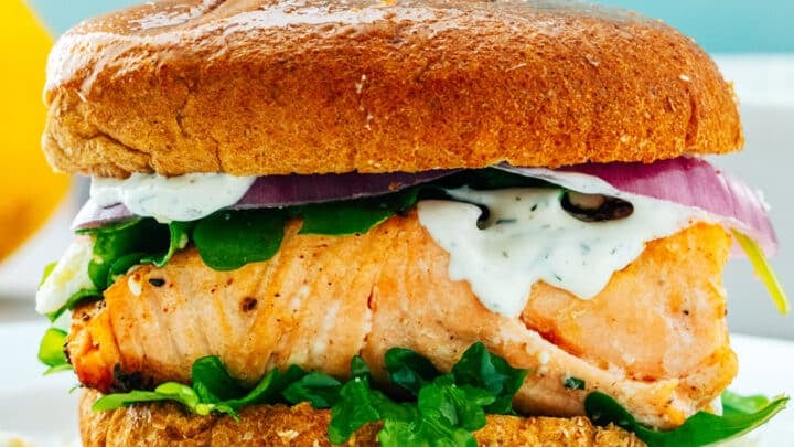 This salmon sandwich recipe is bursting with flavor! Top the savory fish with feta crumbles and creamy dill sauce. Variation: try a Smoked Salmon Sandwich