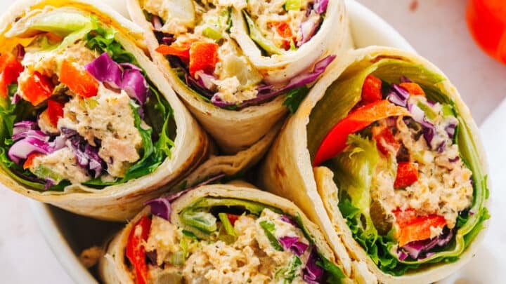 A tuna wrap makes a tasty, easy lunch filled with tuna salad and crunchy veggies! Bookmark this recipe for high protein lunchtime inspiration.