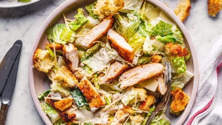This chicken Caesar salad recipe is a total winner for a high protein lunch! We’ll show you how to create this classic salad at home, complete with a creamy Caesar dressing, homemade croutons, and juicy pan seared chicken.