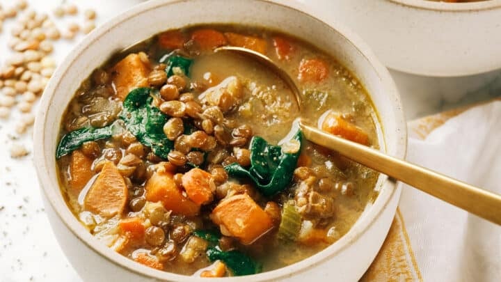 This sweet potato lentil soup is cozy and creamy: a delicious mix of aromatic vegetables with a hint of savory spices. It’s a healthy vegan soup that’s also budget friendly—great as a dinner idea with crusty bread or a simple make ahead lunch.