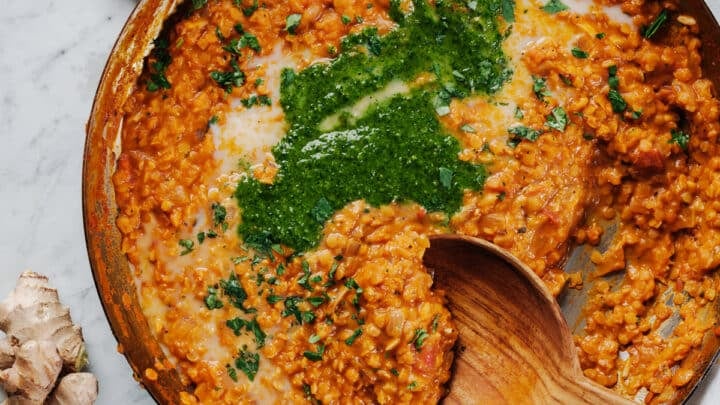 This delicious red lentil curry is packed with flavor and plant based protein, topped with a sparkling cilantro chutney that makes it shine! Serve with rice as a hearty vegan dinner.