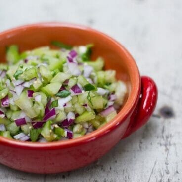 Making this homemade salsa is as easy as dicing the ingredients and mixing everything together. I suggest dicing the tomatillos quite finely since they are a little dense, and you’ll want to wash your hands thoroughly after touching the jalapeño to avoid getting any pepper juice in your eyes. If red onions are too pungent for you, try running the sliced onion under cold water for a few seconds and patting it dry before adding to your salsa. The water mellows out the flavor of the onions without taking away from the overall flavor of this salsa.