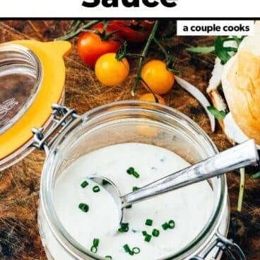 Head to the recipe below for the quantities! Just mix the ingredients in a bowl, and it’s ready! Chopped chives are optional, but they add a lovely onion flavor and look to the sauce.