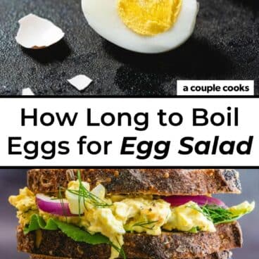 Making egg salad and need to know how long to boil the eggs? It’s not a simple answer, because the eggs don’t actively boil in the water. As soon as the pot of water comes to a boil, turn off the heat! That’s the key to perfectly cooked hard boiled eggs that make for one mean egg salad. Keep reading for a chart showing the timing for different sizes of eggs!
