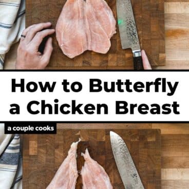 The trick? Butterfly a chicken breast before cooking it! Slicing the chicken breast in half horizontally makes two thinner pieces which cook more evenly. They’re also easier to eat, and it’s easier to infuse seasoning into the thinner pieces of meat. Butterflied chicken breasts are called cutlets.