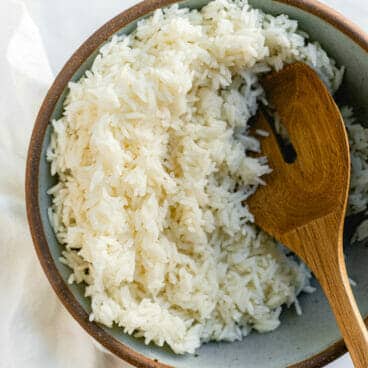 Here’s our tried and true method for cooking up a pot of jasmine rice! It’s perfect for serving with Southeast Asian style curries and stir fries. Alex and I are partial to jasmine rice for its mild, buttery flavor and the texture of the grains when cooked. It makes any curry taste like it just came out of a Thai restaurant. Here’s how to cook jasmine rice: a spin on the traditional method that’s faster and more reliable!