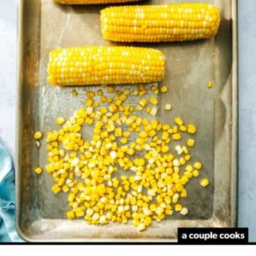 Want to freeze fresh corn cut off the cob? The method is similar, but there are two additional steps. First, cut the corn off the cob (here’s an easy trick for cutting corn!). Then, you’ll have to place the corn on a baking sheet in a single layer to pre-freeze it. This ensures that all the kernels freeze separately, instead of freezing into one large block as they would in a bag.