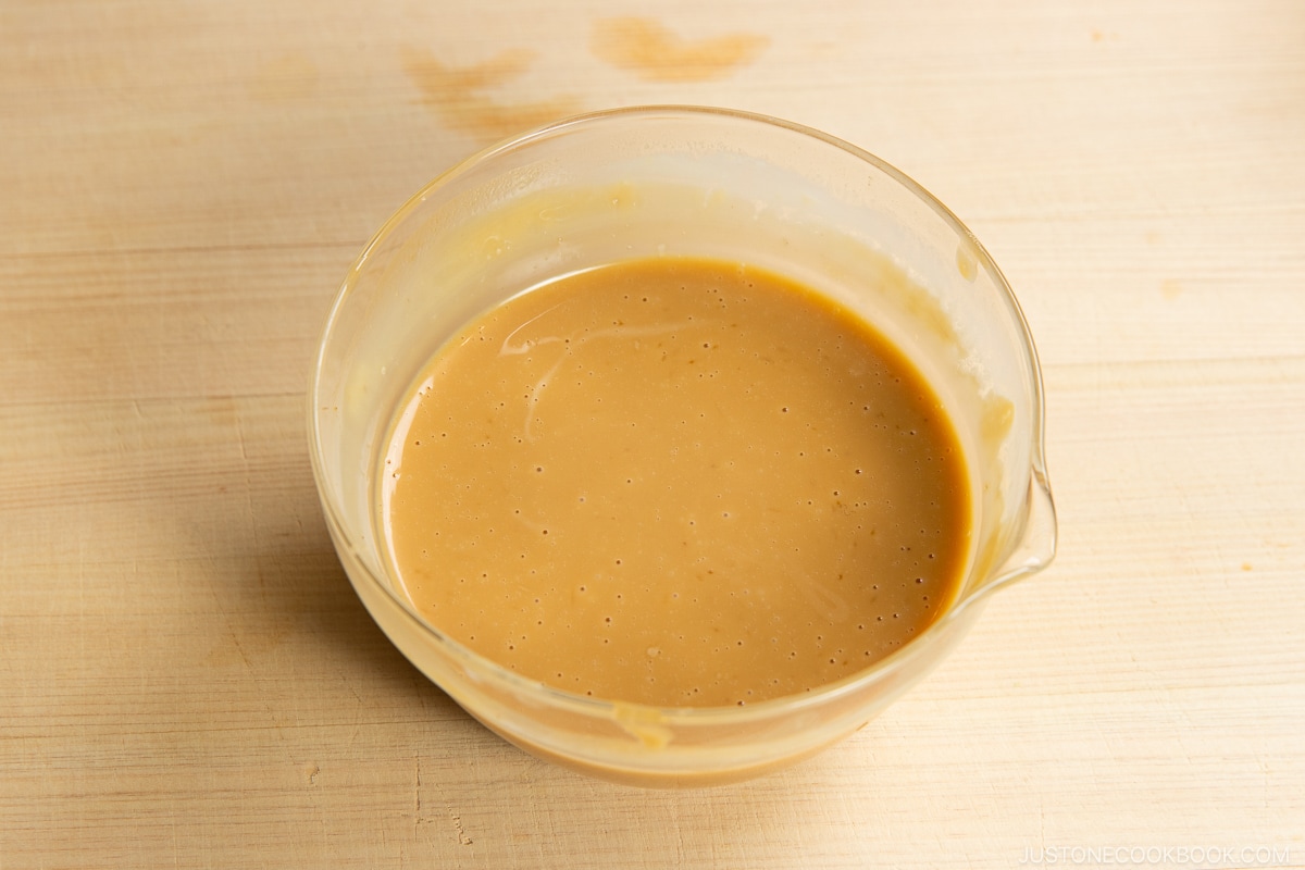- All you need to do is to mix everything. I recommend mixing the sesame paste and sugar first and making sure the sugar is completely dissolved before adding any liquid ingredients.