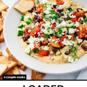 This hummus dip is a play on a layered dip: it’s like taco dip with Mediterranean flavors. It’s very simple to whip up: throw hummus on a platter or in a bowl and top with the toppings. Keep in mind: you’ll want a best quality hummus here: or you can make your own! Here are a few notes on the ingredients you’ll need: