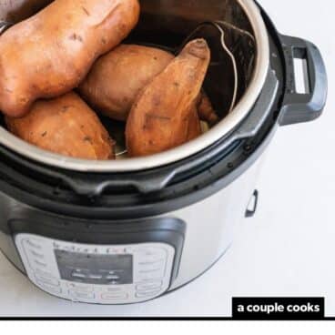 What’s the total time for pressure cooker sweet potatoes? The total time for this recipe is 35 minutes. That’s pretty good compared to about 1 hour for baked sweet potatoes. (Though, we do have a time-saving trick for making a quick baked sweet potato!) Here’s how to make sweet potatoes in an Instant Pot: