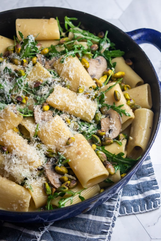 Paccheri pasta is a large tube pasta that is like a bigger version of rigatoni. You can substitute rigatoni, penne or any tube shaped pasta here! Here it's served with Marsala mushrooms, freshly grated parmesan cheese, arugula, and a sprinkling of pistachios, and works just as well for a casual weeknight as it does for a dinner party. via Giada de Laurentiis