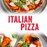 Here’s our definition of Italian pizza: a pizza with simple flavors and a supple, thin crust, that’s cooked in a very hot oven. (This is also the definition we use for our Neapolitan pizza.) The recipe we’ll share below is elegantly simple: a perfect crust, tangy tomato sauce, fresh mozzarella, and a bright green homemade basil pesto.