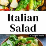 Here’s a great salad that’s simply perfection, in our books. Meet this Italian salad! It’s full of all the right flavors and textures: crisp lettuce, crunchy garlic croutons, and zingy pepperoncini. It’s covered in punchy, herby Italian vinaigrette that makes the flavors sing! And shaved Parmesan seals the deal. It can play sidekick to just about anything. It’s no secret: this recipe is staunchly Italian-American, not a classic Italian recipe. But that’s what we love about this easy salad!