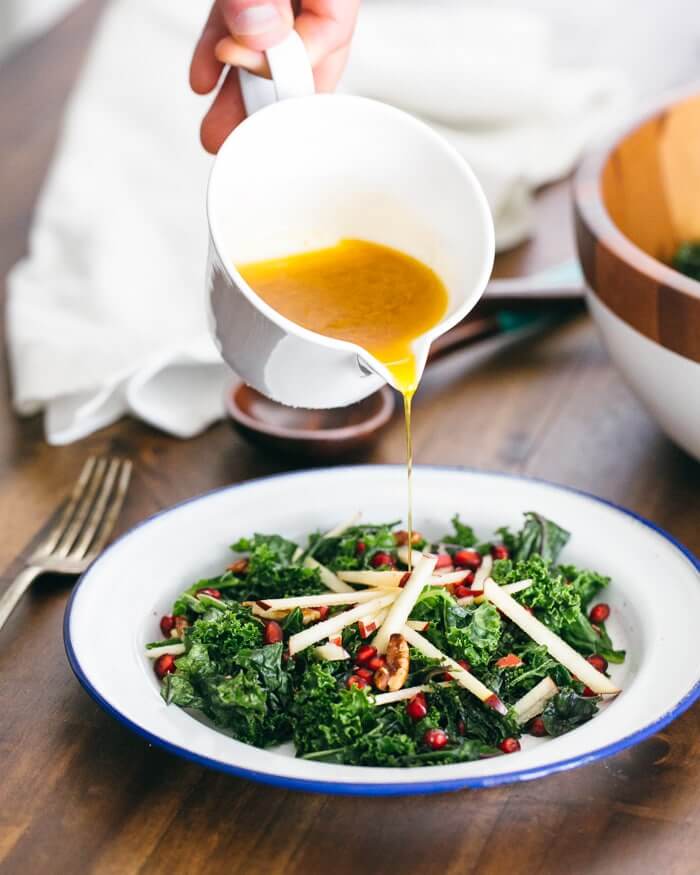 Last up in these kale recipes: massaged kale salad! Massaging the kale before eating it in this salad makes it taste tender and sweet, instead of bitter! All you do is use a little olive oil and massage the leaves so they become softer. The massaged kale is paired with pomegranate seeds and an apple cider vinaigrette: it’s sweet, tangy, and so, so good.