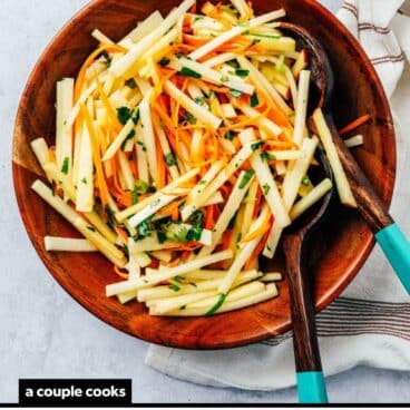 This kohlrabi slaw is my go-to recipe for whenever I find this vegetable. The combination of thinly sliced kohlrabi, sweet carrots, and crisp apple creates the perfect texture, and the tangy vinaigrette brings everything together. It makes kohlrabi into something truly special!