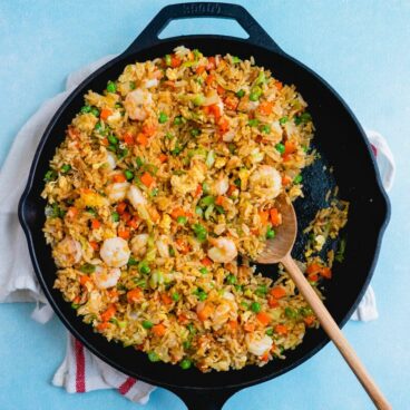 Here’s a classic leftover rice recipe: Shrimp Fried Rice! It’s over the top delicious and total comfort food. Follow this recipe and it’s the path to shrimp fried rice that’s easy and irresistibly tasty. The garlic, ginger and soy sauce meld perfectly with the colorful veggies, bursts of shrimp and gooey bits of egg into a symphony of flavor.