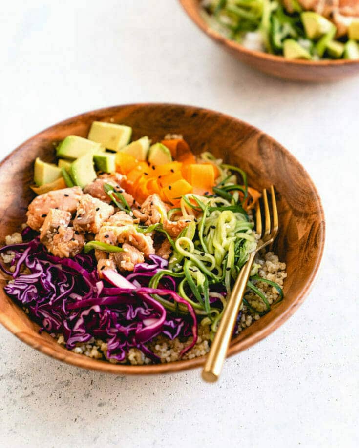 Another bowl meal idea: try this Salmon Poke Bowl! Classic poke bowls traditionally feature raw ahi tuna, but you can use cooked salmon as a fun spin. Load up your bowl with crunchy cucumber noodles and sesame carrot ribbons, quick pickled cabbage, rice, and a savory sauce.
