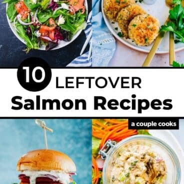 Last up in our leftover salmon recipes: Salmon Dip! This creamy dip has a bit of a retro vibe, which makes it all the more endearing. Our recipe uses a bit of Greek yogurt for a healthier spin. But it’s still chock full of rich flavor: hearty cream cheese and punchy Dijon. Mix it up in 5 minutes, and it’s good for days in the fridge. (Substitute seasoned leftover salmon for the smoked salmon in the linked recipe, then add additional salt to taste until the flavor pops.)