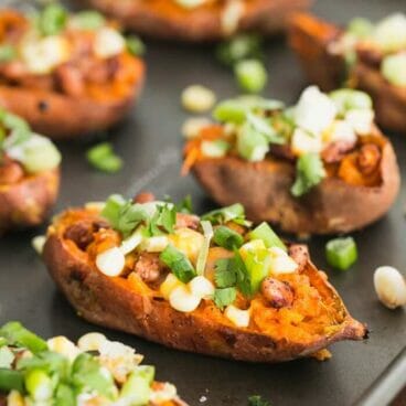 This loaded sweet potato skins recipe is vegetarian and gluten-free.