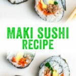Maki sushi is a sushi roll with the seaweed on the outside: and they couldn’t be more fun to make! Here’s a sushi recipe that’s easy to make at home.