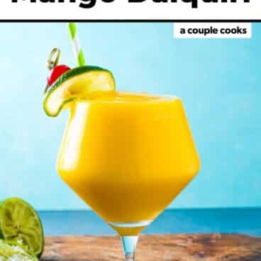 This mango daiquiri is a spin of the Classic Daiquiri, a cocktail invented back in the 1800’s in Cuba. A classic daiquiri is lime, rum, and simple syrup, shaken and strained into a cocktail glass. That’s right: no ice at all! Frozen daiquiris made with ice in a blender came along later, rising to popularity in the 1990’s.