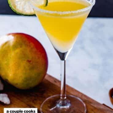 Are you mango obsessed? Try this Mango Martini! This tropical fruit is one of the best ways to mix up your cocktail game, from the Daiquiri to the Mimosa. It’s absolute perfection in this martini recipe, bringing a tropical flair to this sweet tart drink. Add a crunchy sugar rim, and it’s the ideal cocktail for a happy hour or dinner party. Here’s how to make it!
