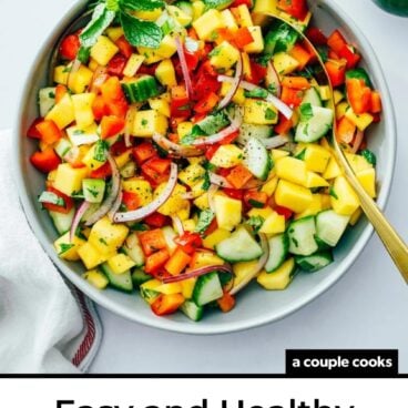 After testing different flavor combinations for mangos, I found this simple mix of ingredients has the perfect balance of sweet, tangy, and herbaceous flavors. Alex and I love serving it alongside grilled salmon or black bean tacos for dinner parties (then add a mango margarita, because why not?)