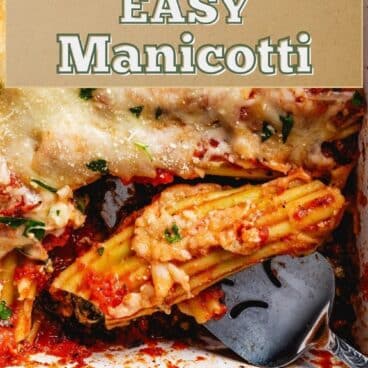 Looking for a cozy pasta bake? Try this manicotti recipe, classic Italian American comfort food at its finest! There’s something so irresistible about pasta tubes filled with three cheeses and bathed in garlicky, tangy tomato sauce. This recipe is truly the easiest way to make manicotti: you don’t even have to boil pasta!