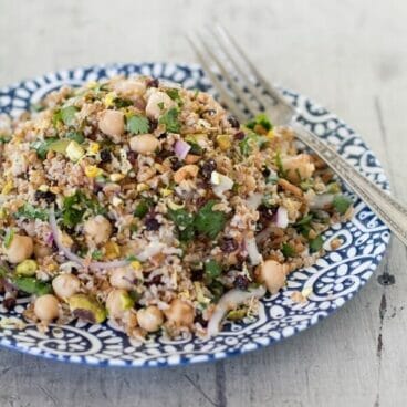 This stunning chickpea and bulgur salad is tangy and fresh, featuring fresh cilantro and parsley, chickpeas, bulgur wheat, currants, and lemon.