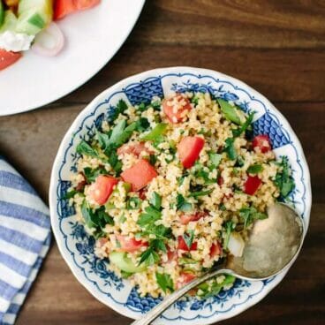 This is a fabulous summer bulgur salad since it’s easy to put together and deliciously light and herby. We love the fact that the bulgur wheat makes this dish a “no cook” grain salad: just pour boiling water over the bulgur and let it sit. It seems like magic each time we do it! This Mediterranean bulgur salad and our Greek salad are perfect options to bring to a summer picnic or barbecue.