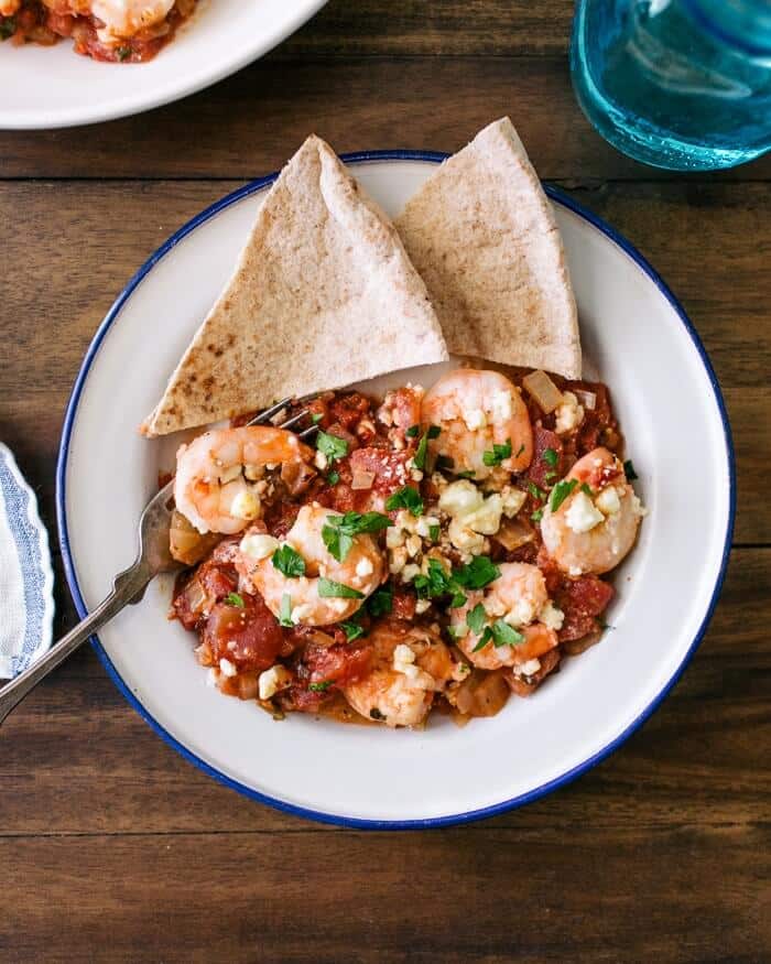 This baked shrimp recipe is incredibly flavorful and easy to make; the shrimp is baked in Mediterranean tomato sauce and sprinkled with feta and parsley.