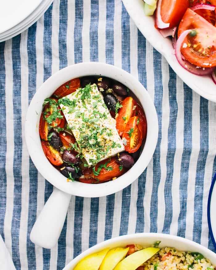 Baked feta with tomatoes is a simple Greek-inspired appetizer that’s ready in under 25 minutes. Serve with bread or enjoy as is!
