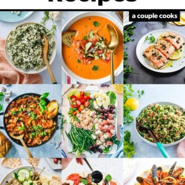 Looking to liven up your meal planning? Look no further than these fresh, bright Mediterranean recipes! The Mediterranean diet has been called one the healthiest in the world: it’s a way of eating that derives from the countries that border the sea with the same name. The recipes you’ll see below are both traditional recipes from those countries (Italy, France, Spain, Greece, Lebanon, and more), and non-traditional recipes inspired by ingredients of those regions. They’re all tasty ways to eat vegetables, whole grains, seafood, and healthy oils. Ready to get started?