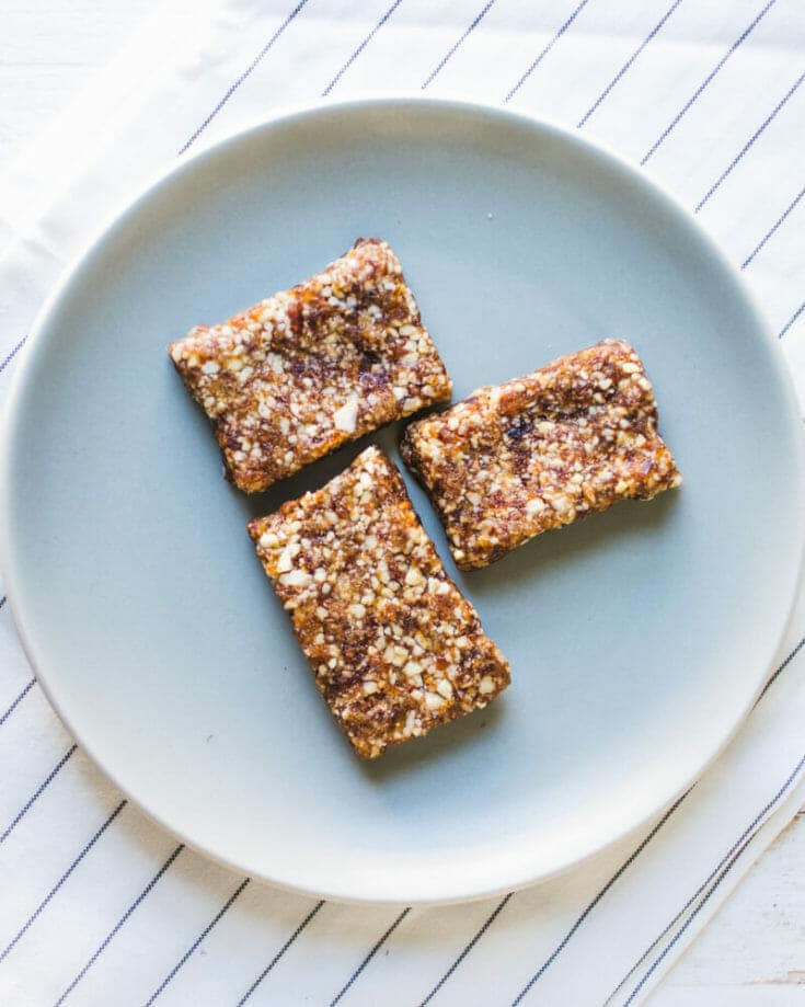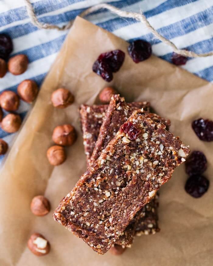 These healthy vegan energy bars are similar to homemade Larabars, but with a little more texture. Like the raw brownie, they’re gluten-free and all natural, made mainly of Medjool dates and nuts. This version uses hazelnuts for a more complex flavor, and dried tart cherries for a tangy note that compliments the sweet.