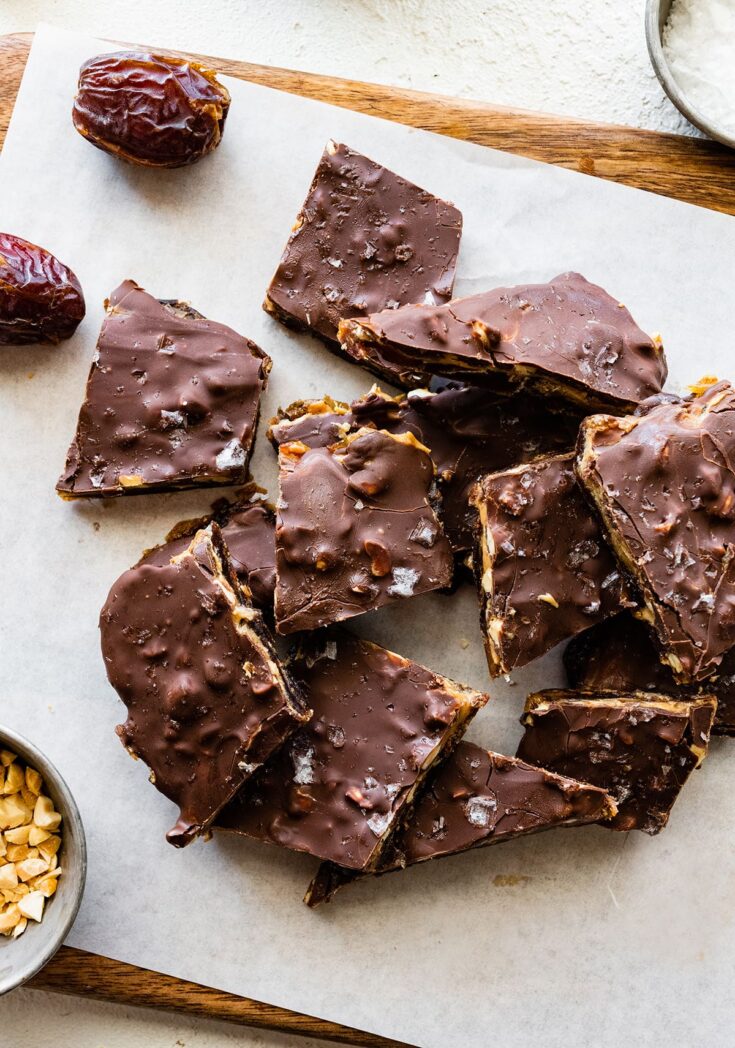 Date bark is like chocolate bark, but with Medjool dates as a base! This TikTok viral recipe combines dates with peanut butter, chocolate and peanuts. It tastes like a Snickers bar and is the perfect vegan and gluten-free treat to keep stocked in your freezer!